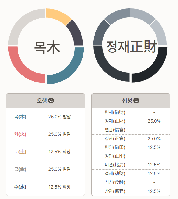 일간(나)의 색깔을 확인했다면, 이제 나머지 7개 글자의 색깔 분포를 보자.