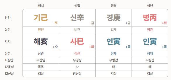만세력 결과 화면을 보면 세로로 네 줄(년, 월, 일, 시)이 나오는데,