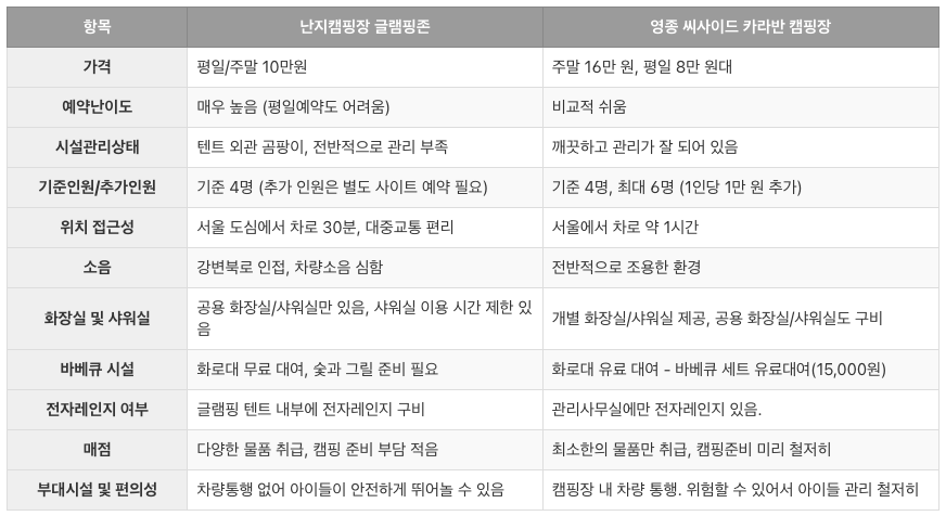 가격, 시설 관리 상태, 기준 인원(수용 인원), 위치 및 접근성, 단점, 부대시설 및 편의성 등을 바탕으로 두 캠핑장을 비교해보고자 하며,