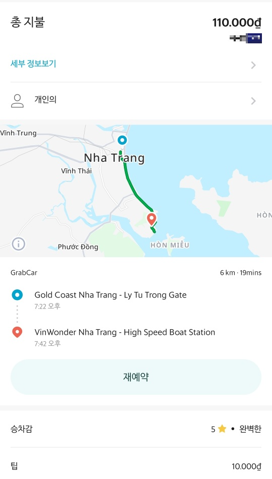 역시나 그랩을 이용하여 이동하였고, 골드코스트 나트랑까지 주행거리 6km, 주행시간 19분이었다. 비용은 4인차량기준 10만동 (그랩기사분이 워낙 친절하셔서 주행종료 후 1만동은 팀으로 추가 결제했다.)