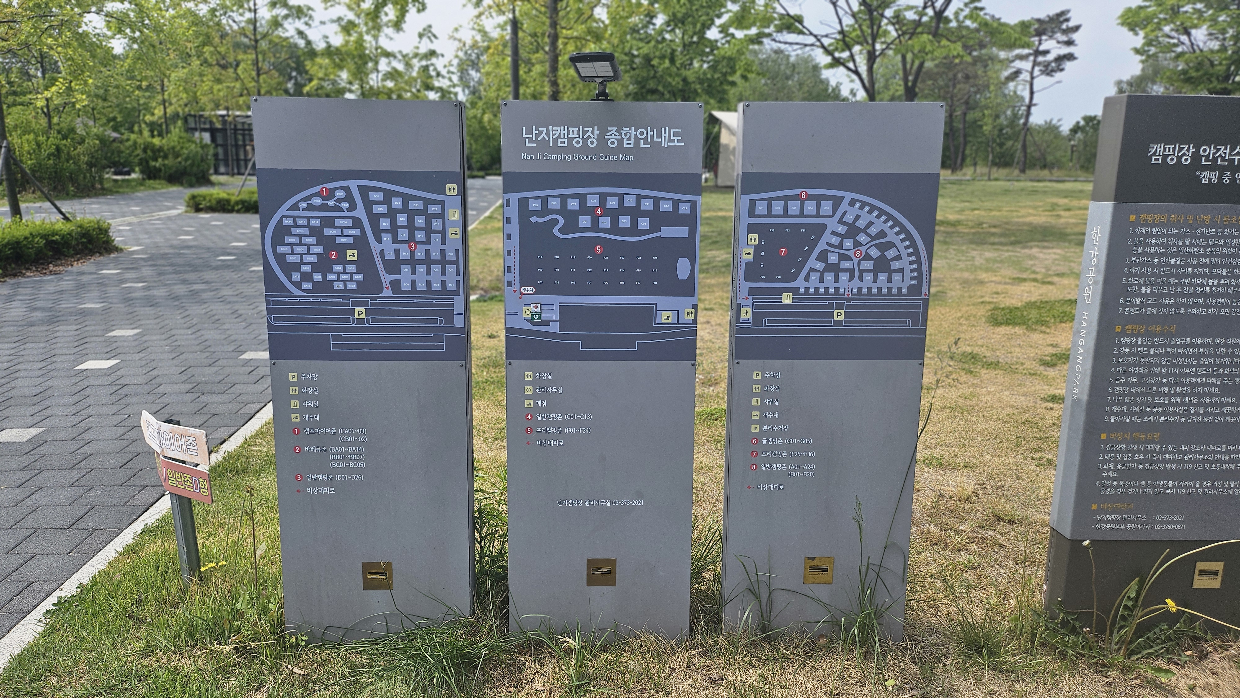 난지캠핑장은 총 155면으로 자갈형(파쇄석)과 데크형으로 구성된 일반캠핑존 83면, 잔디밭에서 즐기는 프리캠핑존 36면, 모든것이 갖춰져있어서 준비물없이 음식만 준비해오면 되는 글램핑존 5면이 있어요.