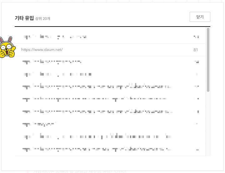 주소가 다음 주소라 검색을 통한 유입이 아닐까 생각하시는 분들도 있겠지만, 포털페이지에서 검색을 통한 유입은 검색유입 건수로 잡히기 때문에, 기타 유입은 순전히 다른 경로라고 보면 된다.