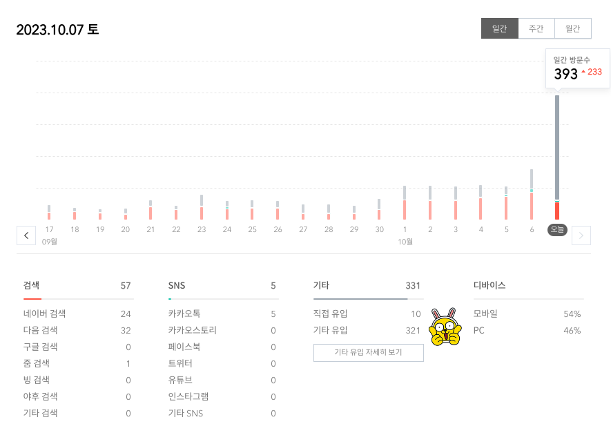 그동안 방문자수가 큰 변화 없이 유지되다가 오늘 갑자기 지표가 상승하는 모습을 보인다.
